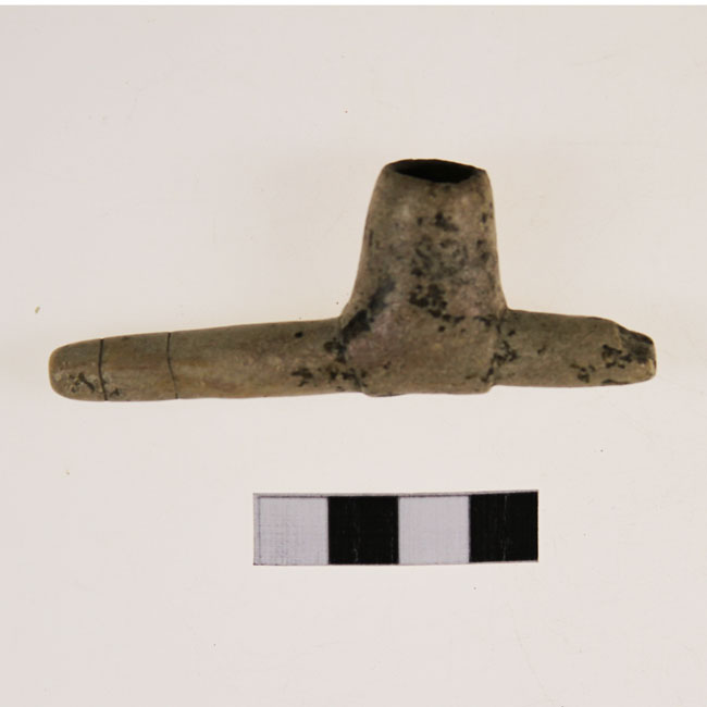 Objeto de uso doméstico y/o ritual en forma de T. Presenta hornillo completo de forma cónica evertido y tubo cerrado de forma subcónica. La superficie se trabajó por medio del pulimentado y presenta líneas rectas paralelas decorativas. También es posible apreciar huellas de uso con estrías.