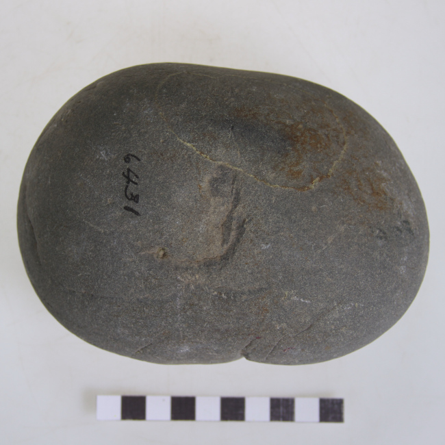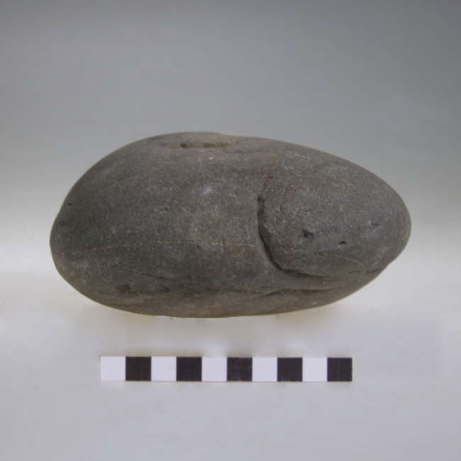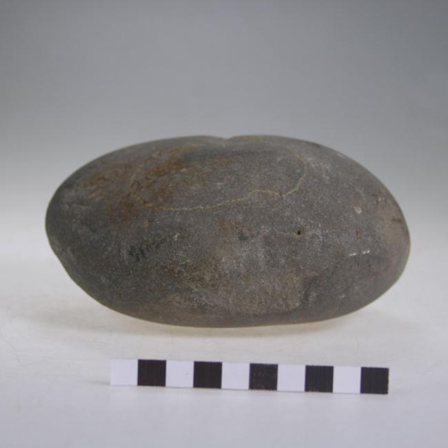 Objeto de uso doméstico, correspondiente a un martillo lítico de forma subelipsoidal. Presenta superficies activas con evidencias de piqueteo y golpes reiterados, visibles como áreas de desgaste y microfracturas. No presenta modificaciones formales adicionales.