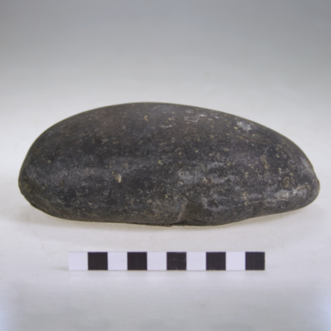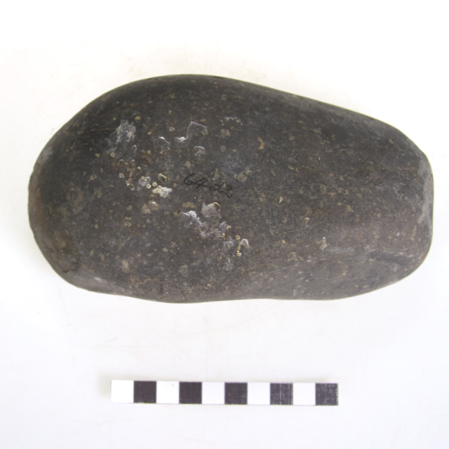 Objeto de uso doméstico, correspondiente a un martillo lítico de forma subelipsoidal. Presenta superficies activas con evidencias de piqueteo y golpes reiterados, visibles como áreas de desgaste, microfracturas y lascados. No presenta modificaciones formales adicionales.