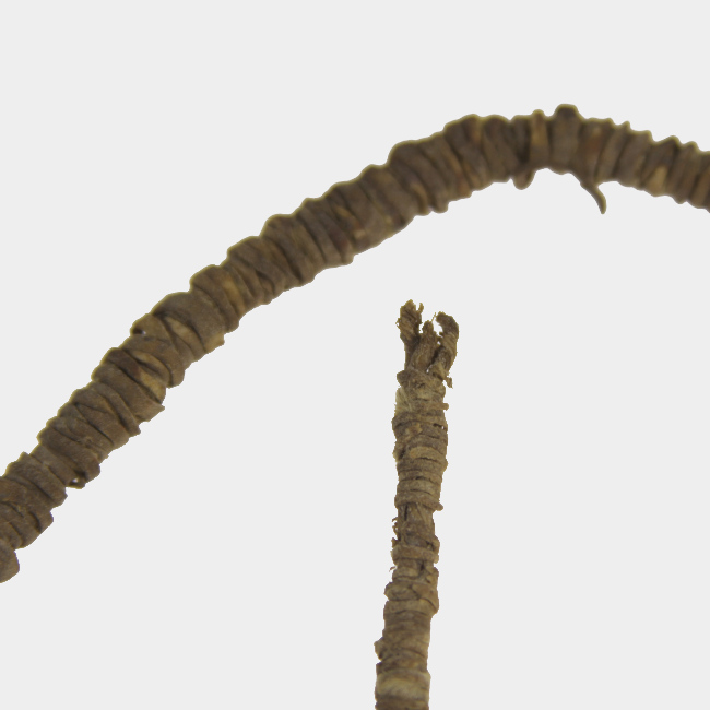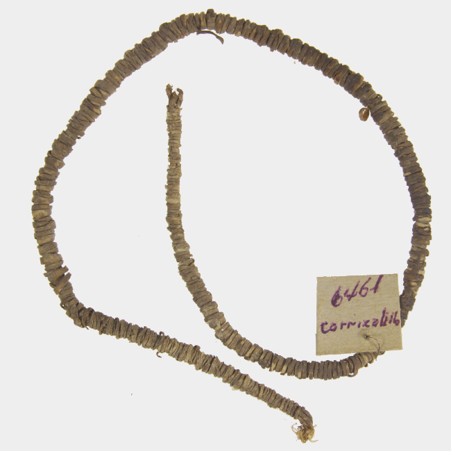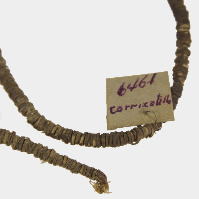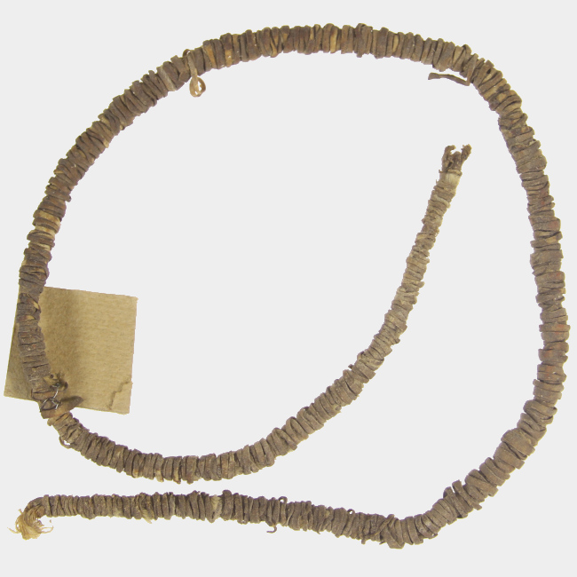 Objeto posiblemente ornamental de uso personal, correspondiente a un haz de cuero aparentemente trenzado, embarrilado por una fina cinta del mismo material.