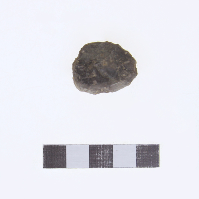 Objeto de uso doméstico de talla bifacial de forma subcircular y sección plano convexa. Se encuentra elaborado sobre una matriz bifacial de color gris oscuro. Presenta un borde activo de forma convexa.
