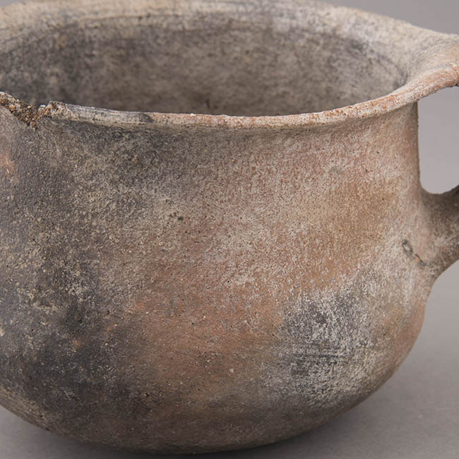 Base ligeramente plano convexa. Superficie sin tratamiento , coloración natural de la arcilla, a excepción de la mitad frantal con ennegrecimiento por efecto de la expoisición al fogón.