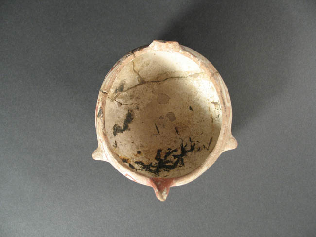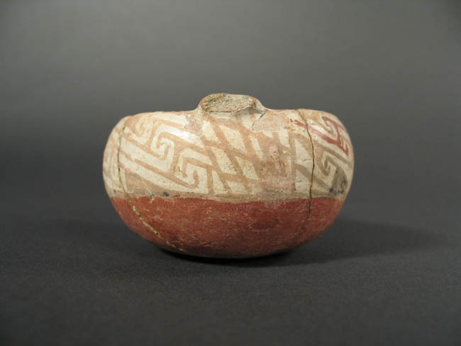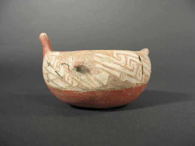 Vasija semiesferoidal, no restringida y contorno simple o unidireccional (sin puntos de quiebre o inflexión), base convexa y punto de término (labio) redondeado. Tratamiento superficial con la técnica de engobe y pigmento colorante, interior blanco y una guarda o banda decorativa externa, con diseño de ganchos continuos y ornitomorfa (ave), en tonalidades negro, rojo sobre blanco.