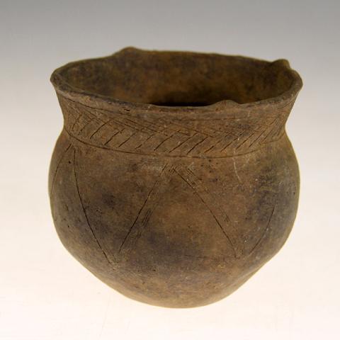 Pieza simétrica, ligeramente restringida con cuello, de perfil compuesto. Cuerpo subesférico (2/3 superior subesférico, 1/3 inferior tronco-cónico). Cuello tronco-cónico. Borde recto. Labio plano con cuatro botones en paralelo. Base circular, plana y restringida. De superficie alisada, de color café pardo. Posee una banda decorativa incisa geométrica en base a líneas paralelas en forma de "V" horizontal en el cuello. El cuerpo presenta decorados incisos en base a una banda estrecha de líneas paralelas en forma de triángulos sin base con sus puntas hacia el cuello.