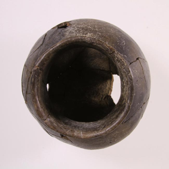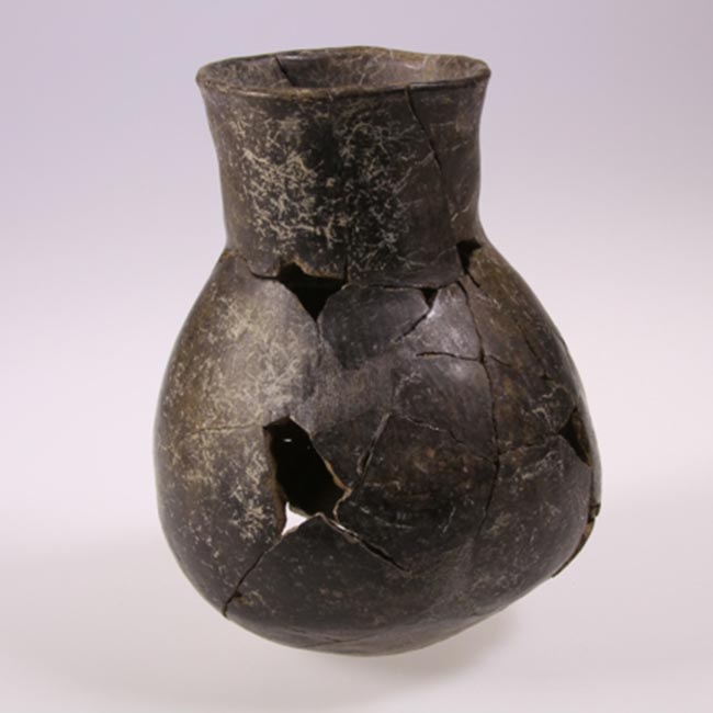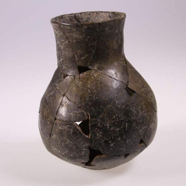 Pieza sin asa, simetrica, restringida con cuello; con perfil inflectado, cuerpo subesférico; cuello tronco cónico; borde evertido, labio biselado, base circular y plana con insinuación de torus, tratamiento de superficie pulido; de color negro.