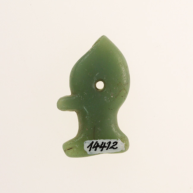 Objeto ornamental de uso personal de forma irregular (modelado ictiomorfo) y sección transversal plana, elaborado en Combarbalita de color verde. Presenta una perforación bicónica en la sección central.