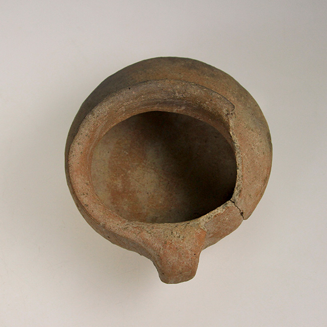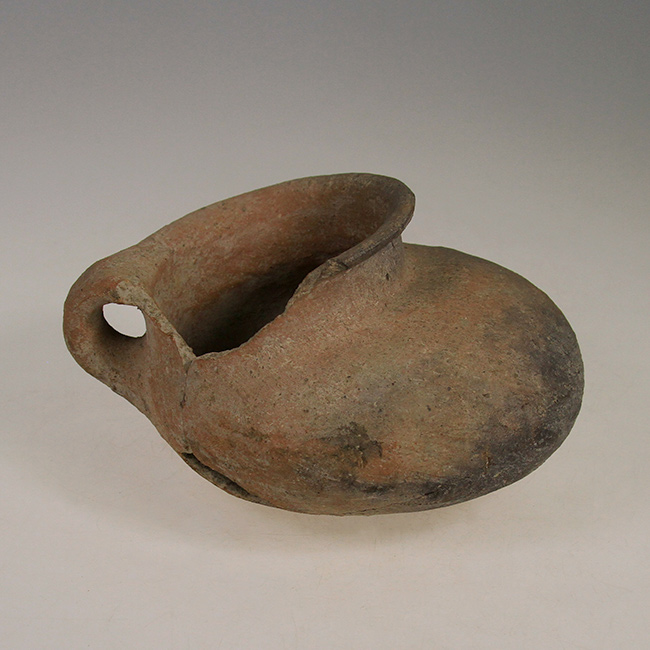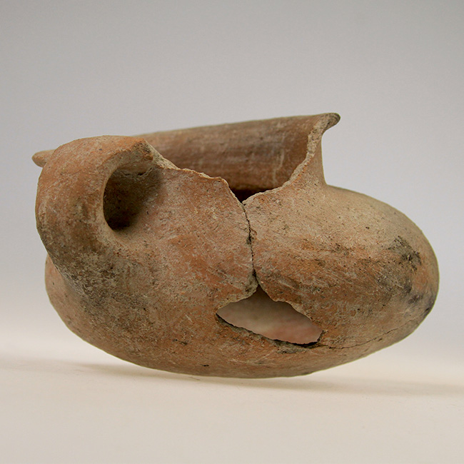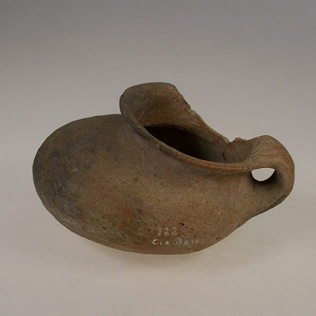 Contenedor de uso ritual y/o doméstico asimétrico, de estructura restringida con cuello y perfil compuesto. Corresponde a una vasija o jarro zapato de cuerpo elipsoidal y cuello hiperboloide, borde evertido y base convexa, con un asa vertical labioadherida. Su superficie es marrón monocroma alisada, con huellas de hollín debido a la exposición al fuego.