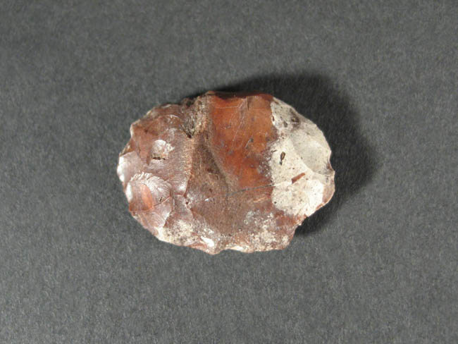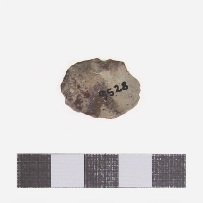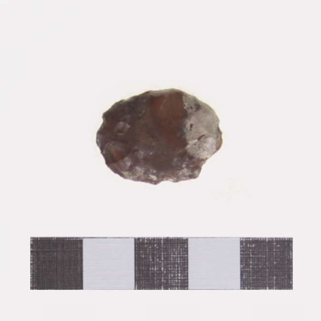 Objeto de uso doméstico de talla bifacial de forma subelipsoidal y sección plano convexa. Se encuentra elaborado sobre una matriz de color marrón con manchas blanquecinas. Presenta un borde activo de forma convexa.