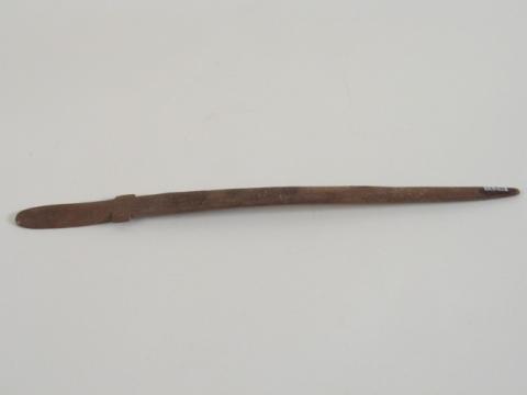 Espátula confeccionada en una pieza de madera. Posee un pequeño receptáculo de forma oblonga de sección semicircular tallada en bajorelieve. El mango, del mismo ancho que la pala se va angostando hasta terminar en una punta roma; su sección es plana y está ligeramente curvado hacia arriba. Posee una decoración tallada de forma rectangular entre el mango y la pala, siendo más ancha que éstos. Esta herramienta es parte del equipo inhalatorio ligado al consumo de alucinógenos.