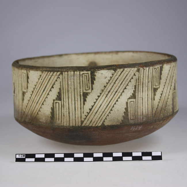 Superficie engobada, con interior blanco y una guarda externa con diseños Zigzag en colores rojo y negro sobre blanco.
