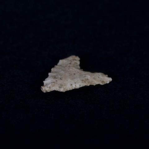 Objeto de uso doméstico de talla bifacial, elaborado en sílice opaco de color gris, de forma triangular apedunculada, de base cóncava y sección irregular.
