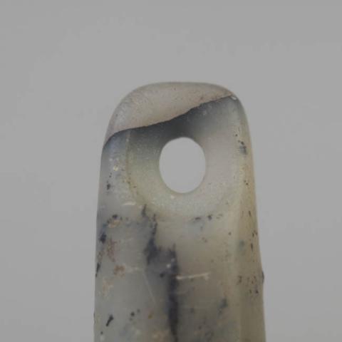 Objeto ornamental de uso personal elaborado en piedra talcosa opaca de color verde claro con vetas negras, de forma y sección elipsoidal. Presenta una perforación cilíndrica ubicada en la parte superior.