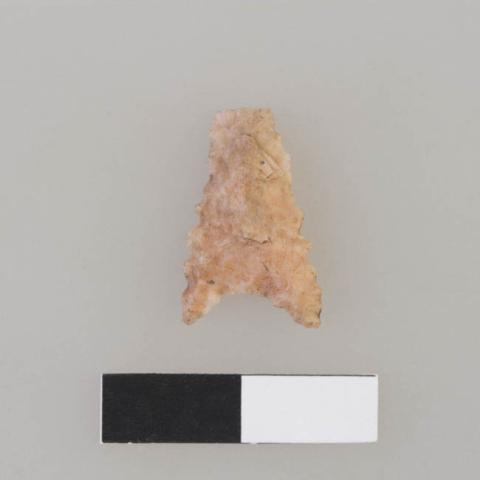 Objeto de uso doméstico de talla bifacial elaborado en sílice opaco de color anaranjado, de forma triangular, base cóncava con aletas y borde denticulado.