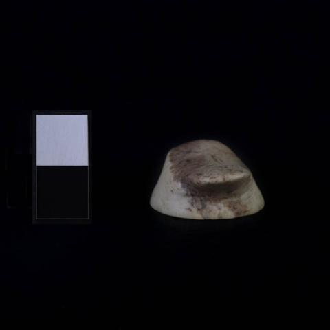Objeto ornamental de uso personal elaborado en combarbalita de color blanco con vetas café claro, de forma cilíndrica. Presenta dos apéndices laterales de forma convexa para permitir su sujeción al labio inferior. La porción del botón es hiperboloide, siendo hacia proximal más estrecho y hacia distal de mayor diámetro. En la literatura del área, este tipo de adorno ha sido definido como tembetá de botón con aleta.