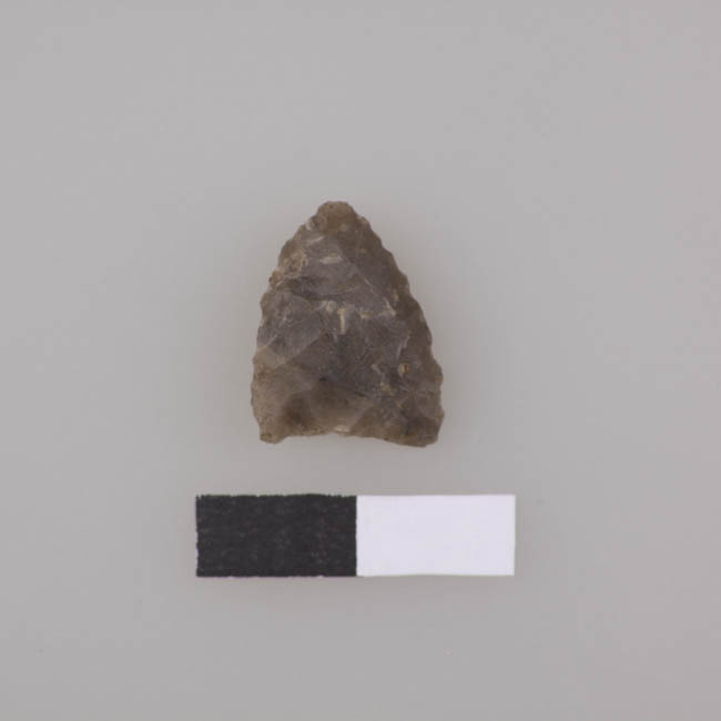 Objeto de uso doméstico de talla bifacial, elaborado en sílice de color gris oscuro, de forma triangular apedunculada, de base recta y sección transversal biconvexa.