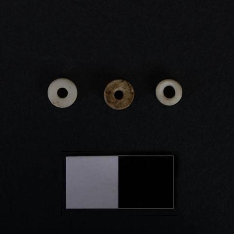 Objetos ornamentales de uso personal, dos de color blanco y uno café. Todos presentan forma discoidal, sección transversal plana, bordes rectos y una perforación central cilíndrica.
