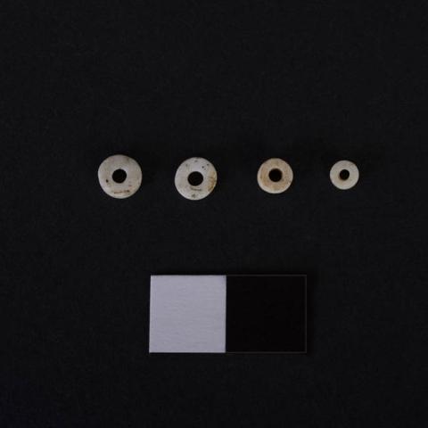 Objetos ornamentales de uso personal de color blanco y forma discoidal. Todos presentan una sección transversal plana, bordes rectos y una perforación central cilíndrica.