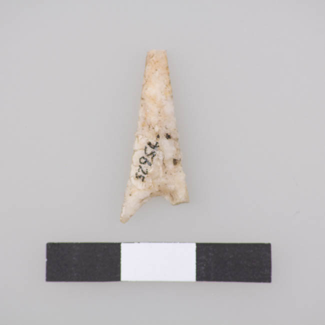 Objeto de uso doméstico de talla bifacial, elaborado en sílice de color blanco con vetas amarillas. Presenta forma triangular apedunculada, de base cóncava con aletas y sección biconvexa.