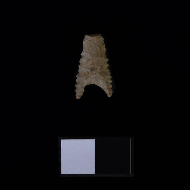 Objeto de uso doméstico de talla bifacial, elaborado en sílice de color amarillo, de forma triangular apedunculada, base cóncava con aletas, bordes aserrados y sección transversal biconvexa.