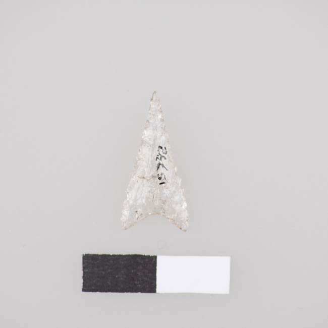 Objeto de uso doméstico de talla bifacial, elaborado en cristal de roca de forma triangular apedunculada, de base escotada con aletas y sección biconvexa.
