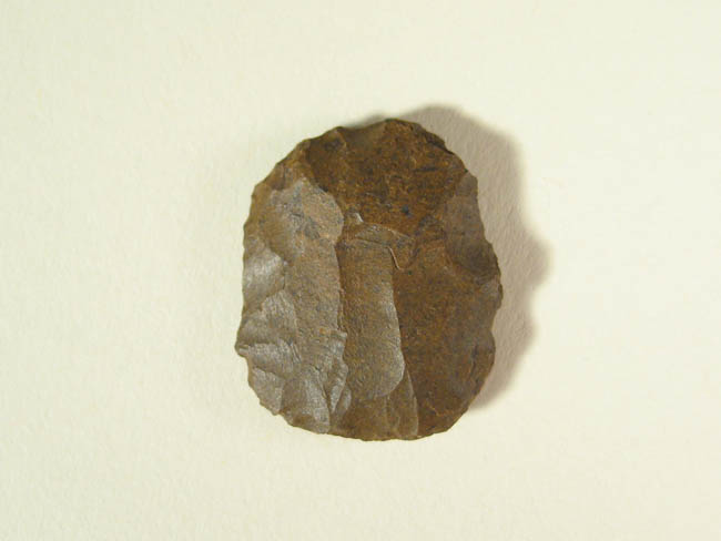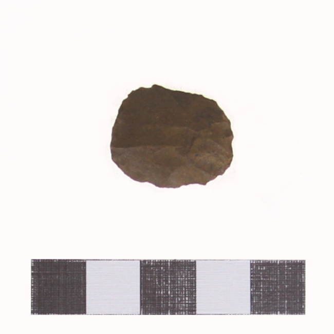 Objeto de uso doméstico de talla bifacial de forma subelipsoidal y sección biconvexa. Se encuentra elaborado sobre una matriz de color marrón. Presenta un borde activo de forma convexa.