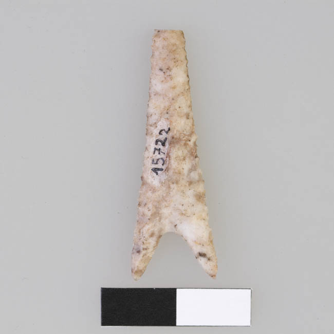 Objeto de uso doméstico de talla bifacial, elaborado en sílice de color blanco con vetas grises de forma triangular apedunculada, de base escotada con aletas y sección biconvexa.