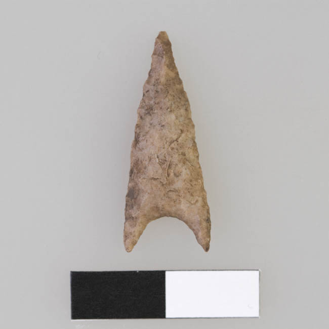 Objeto de uso doméstico de talla bifacial, elaborado en sílice de color gris con vetas negras de forma triangular apedunculada, de base escotada con aletas y sección biconvexa.