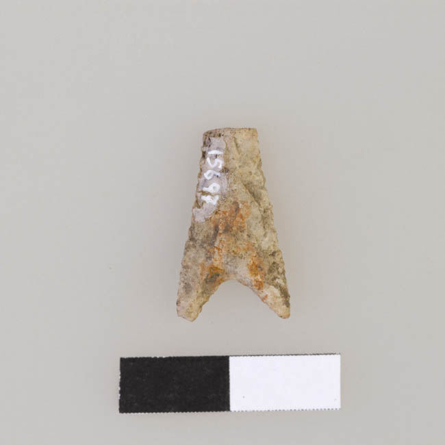 Objeto de uso doméstico de talla bifacial, elaborado en sílice de color gris con vetas amarillas de forma triangular apedunculada, de base escotada con aletas y sección biconvexa.