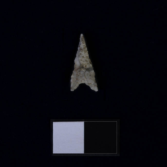 Objeto de uso doméstico de talla bifacial elaborado en sílice opaco de color blanco con incrustaciones de color café claro de forma triangular apedunculada, de base cóncava con aletas y sección biconvexa.