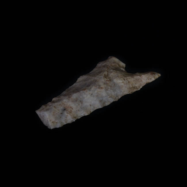 Objeto de uso doméstico de talla bifacial, elaborado en sílice opaco de color gris claro de forma triangular apedunculada, de base escotada con aletas y sección biconvexa. Presenta bordes aserrados.