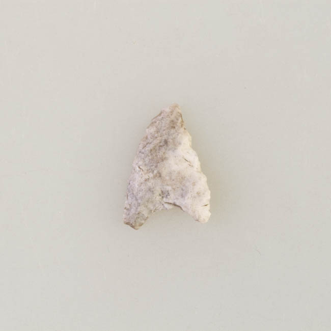 Objeto de uso doméstico de talla bifacial, elaborado en sílice opaco gris claro con vetas grises oscuras de forma triangular apedunculada, de base cóncava con aletas y sección irregular.