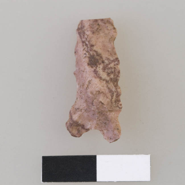 Objeto de uso doméstico de talla bifacial, elaborado en sílice de color rosado de forma triangular apedunculada, de base cóncava con aletas y sección biconvexa.