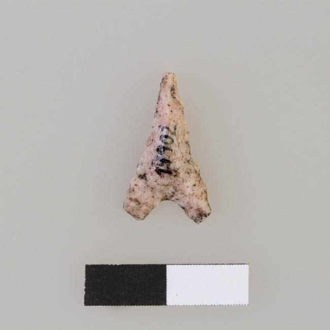 Objeto de uso doméstico de talla bifacial, elaborado en sílice opaco de color rosado claro con vetillas negras de forma triangular apedunculada, de base escotada con aletas y sección biconvexa.