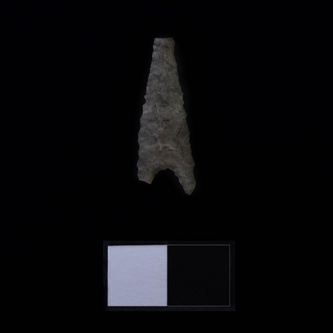 Objeto de uso doméstico de talla bifacial, elaborado en sílice de color gris, de forma triangular apedunculada, base escotada con aletas y sección trasversal biconvexa.