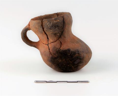 Contenedor restringido de perfil compuesto. Presenta un borde y cuello invertido, de paredes curvas. Posee un cuerpo ovoide con base plana. Se observa un asa curva de sección circular adherida de labio a cuerpo de orientación vertical. Superficie alisada de color café (Atlas Munsell: 5 YR 4/3 Reddish brown) con manchas de hollín en el cuerpo. Asociada a camélido 51 en fosa del individuo 199 (niño) y camélido 51.