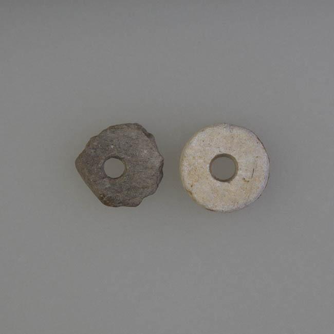 Objetos ornamentales de uso personal elaborados en piedra talcosa. Uno es de color gris claro y el otro es de color gris oscuro. Ambos son de forma discoidal, sección transversal plana y presentan una perforación central cilíndrica.