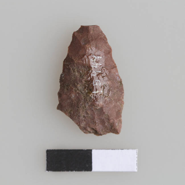 Objeto de uso doméstico de talla bifacial, elaborado en sílice opaco de color burdeo, de forma lanceolada apedunculada, base recta y sección transversal biconvexa.