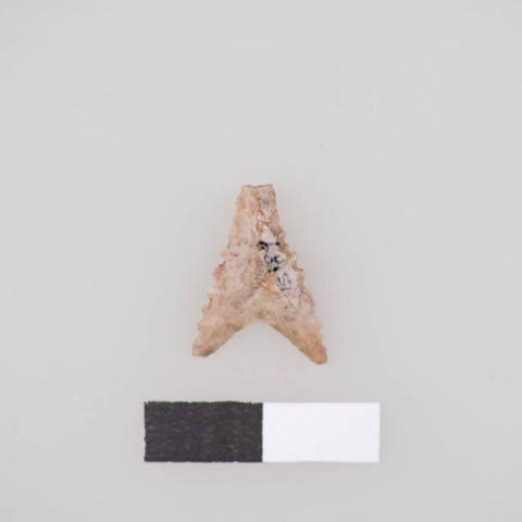 Objeto de uso doméstico de talla bifacial, elaborado en sílice de color café claro, de forma triangular apedunculada, base escotada con aletas y sección transversal biconvexa.