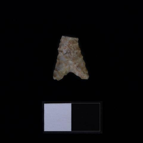 Objeto de uso doméstico de talla bifacial, elaborado en sílice de color café con vetas blancas de forma triangular apedunculada, de base escotada con aletas y sección biconvexa.