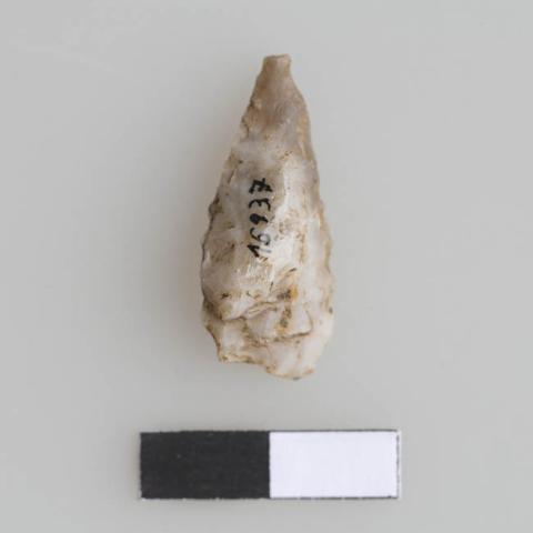 Objeto de uso doméstico de talla bifacial, elaborado en sílice de color gris claro y blanco opaco de forma lanceolada apedunculada, de base recta y sección biconvexa.