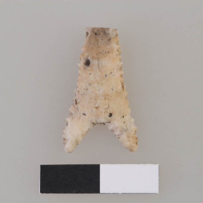 Objeto de uso doméstico de talla bifacial, elaborado en sílice de color blanco con vetas amarillas. Presenta forma triangular apedunculada, base cóncava con aletas y sección biconvexa. Sus bordes se observan aserrados.
