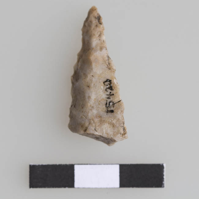 Objeto de uso doméstico de talla bifacial, elaborado en sílice de color gris opaco de forma triangular apedunculada, de base indeterminada y sección biconvexa.