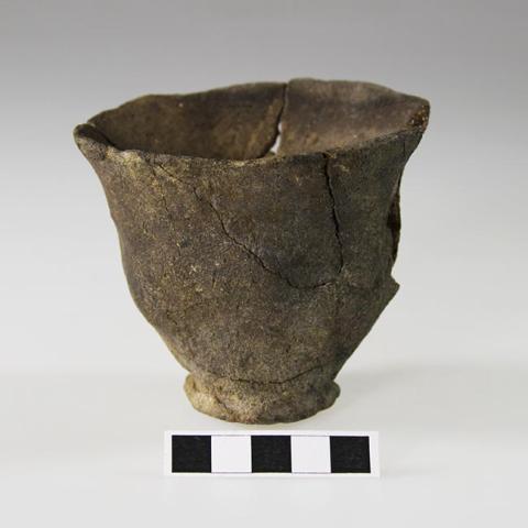 Pieza simetrica; no restringida con cuello, perfil inflectado. Cuerpo subesferico. Cuello tronco-conico y estrecho. Borde evertido. Labio redondeado e irregular. Base Torus circular y plano. Superficie burda de color pardo-rojo interior, negro exterior.