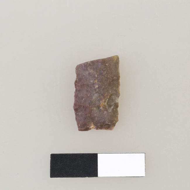 Objeto de uso doméstico de talla bifacial, elaborado en sílice de color burdeo. Presenta forma foliácea apedunculada, base recta y sección biconvexa.