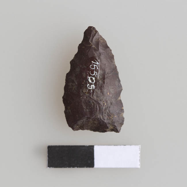 Objeto de uso doméstico de talla bifacial, elaborado en sílice opaco de color burdeo oscuro, de forma lanceolada apedunculada, de base recta y sección transversal biconvexa.