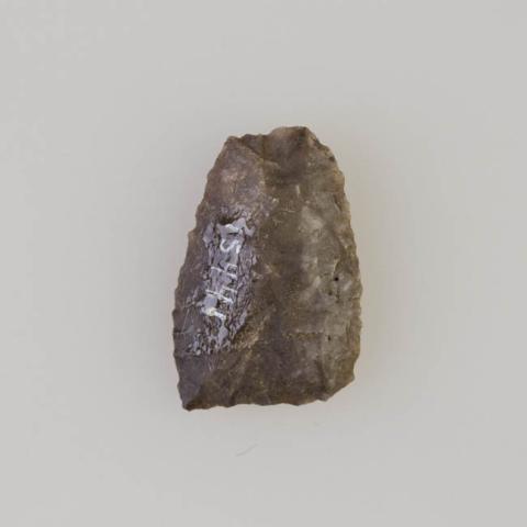 Objeto de uso doméstico elaborado sobre una lasca de sílice de color gris con vetas blancas. Presenta forma lanceolada, bordes activos convexos y sección biconvexa.