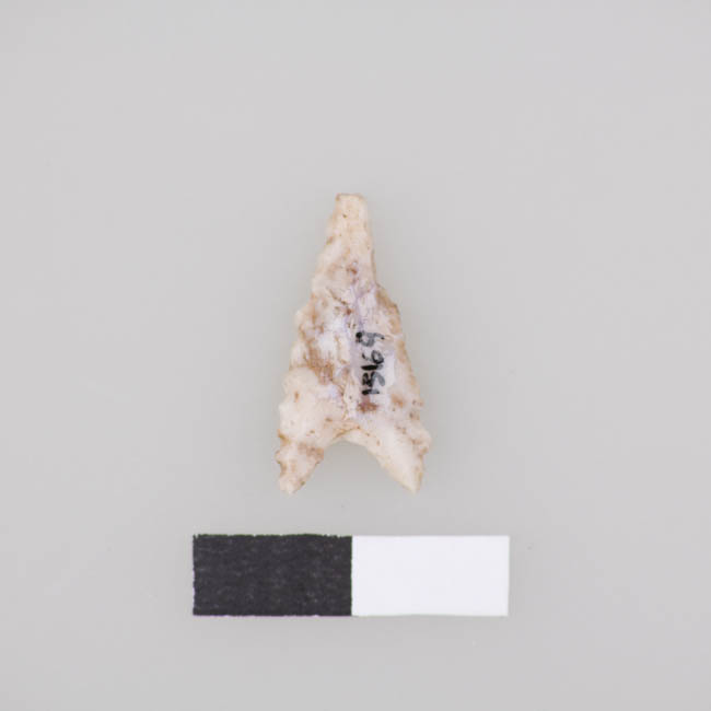 Objeto de uso doméstico de talla bifacial, elaborado en sílice opaco de color blanco con vetas café claro de forma triangular apedunculada, base escotada con aletas y sección biconvexa.
