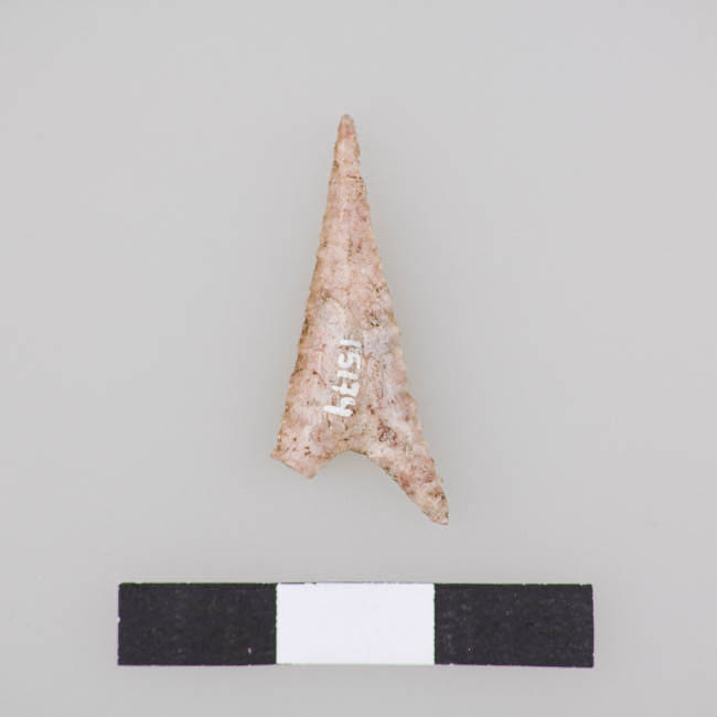 Objeto de uso doméstico de talla bifacial, elaborado en sílice de color rosado con vetas rojas. Presenta forma triangular apedunculada, base cóncava con aletas y sección romboidal.
