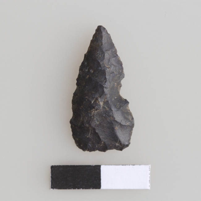 Objeto de uso doméstico de talla bifacial, elaborado en sílice opaco de color negro de forma lanceolada apedunculada, de base recta y sección plano-convexa.