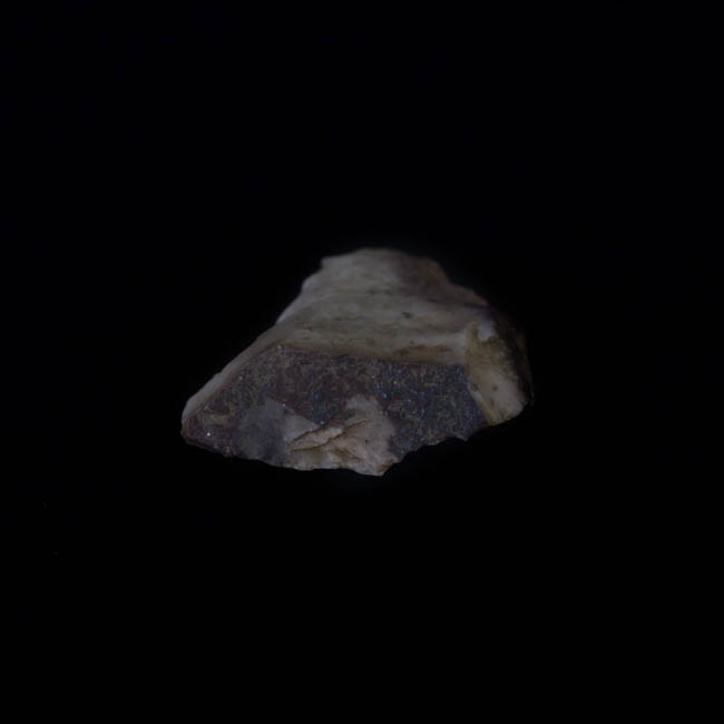 Objeto doméstico elaborado sobre lasca de sílice opaco de color blanco, de forma subtriangular, con un borde activo cóncavo, retoque facial -marginal y sección transversal irregular.